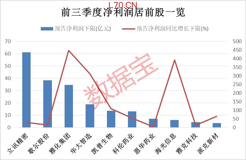按照预告下限数据来看,立讯精密(002475)、歌尔股份(002241)、雅化集团等6股预告前三季度归母净利润额超过10亿元。立讯精密预测前三季度净利润约60.97亿元至65.66亿元,变动幅度为30%至40%。本周以来,立讯精密获得北上资金青睐,累计净买入额超3亿元。