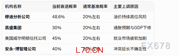 汇通财经APP讯——根据 汇通财经APP 报道,由于美以伊冲突持续延宕,美国经济正承受额外下行压力,多家金融机构近日显著上调未来12个月陷入衰退的概率。这一调整主要源于冲突导致的国际油价快速攀升,以及由此引发的通胀预期升温和增长前景恶化。正常年份下,该概率基准值通常维持在20%左右,而当前水平已进入较高警戒区间,显示地缘因素正成为主导风险变量。