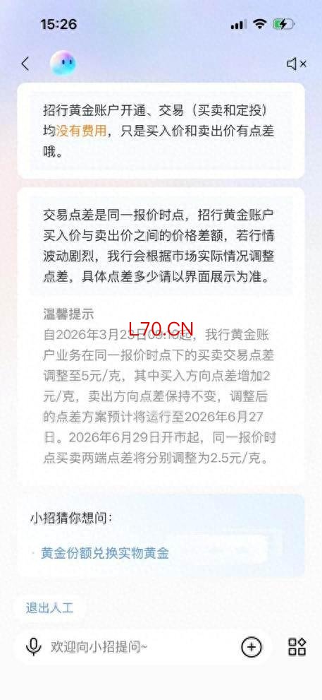 例如,招商银行APP显示,自2026年3月23日起,该行黄金账户业务在同一报价时点下的买卖交易点差调整至5元/克,其中买入方向点差增加2元/克,卖出方向点差保持不变。调整后的点差方案预计将运行至2026年6月27日。2026年6月29日开市起,同一报价时点买卖两端点差将分别调整为2.5元/克。
