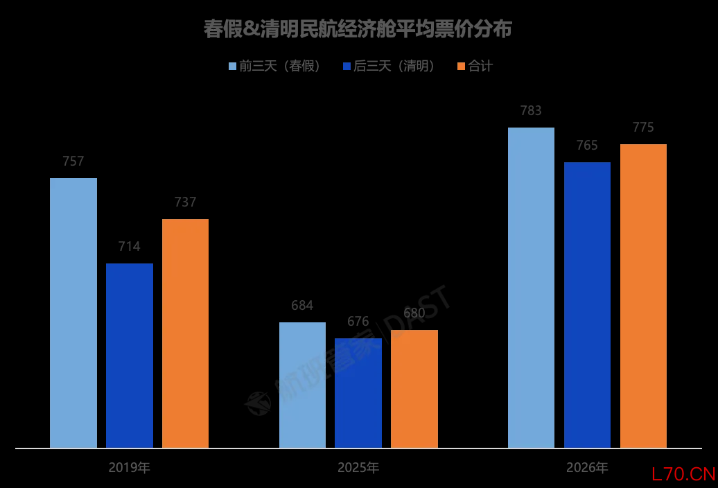 根据航班管家的监测,2026年春假&清明假期期间,民航国内经济舱平均票价达775元,同比2025年增长13.9%,同比疫情前的2019年也增长5.2%。