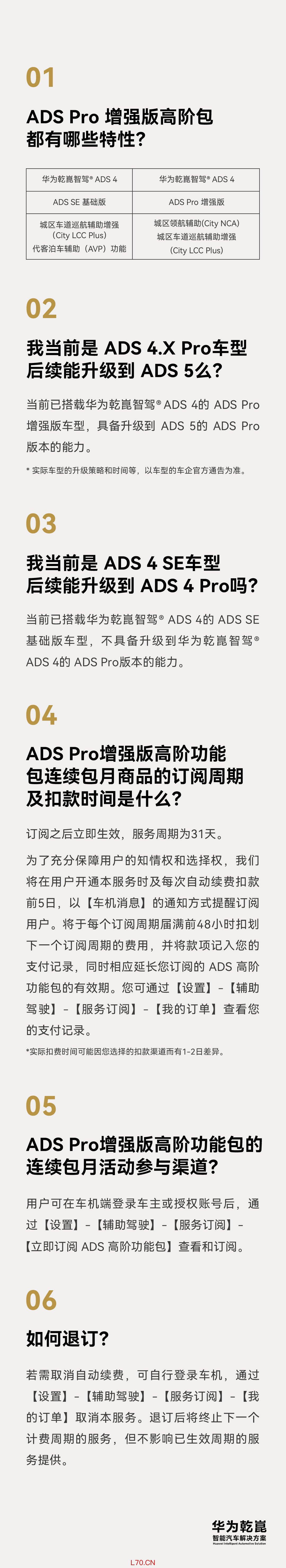 针对用户的升级需求,官方明确:当前已搭载华为乾崑智驾 ADS 4 的 ADS Pro 增强版车型,后续具备升级至 ADS 5 的 ADS Pro 版本的能力,但具体升级时间和策略需以各车企的官方通知为准;ADS 4 SE 基础版车型暂不支持升级至 ADS 4 Pro 版本。