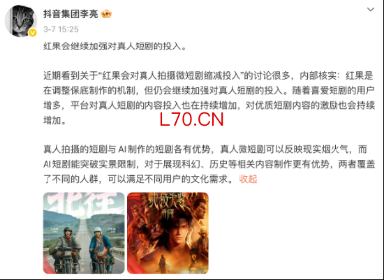 近日,“红果将砍掉九成真人短剧项目”“取消保底分成机制”等消息在社交媒体上快速传播。其后,抖音集团副总裁李亮在微博发文,明确表示“红果短剧是在调整保底制作的机制,但仍会继续加强对真人短剧的投入”。