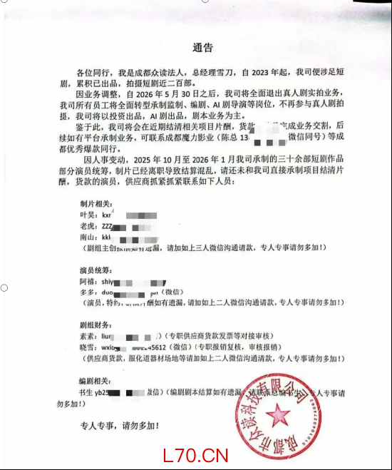 近日,知名短剧公司成都众读就发布了通告,宣布从今年5月30日之后,成都众读将全面退出真人剧实拍业务,所有员工将全面转向承制兼制、编剧、AI漫剧导演等岗位,不再参与真人剧拍摄,公司后续业务将以投资出品AI漫剧及剧本为主。