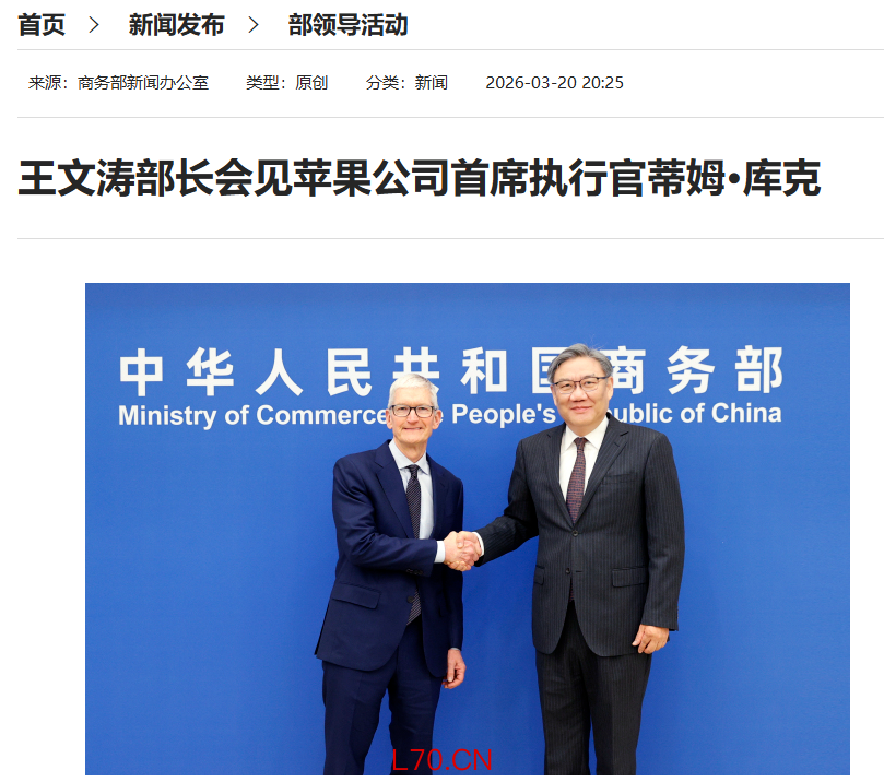 而在 20 日,商务部部长王文涛会见苹果公司首席执行官蒂姆 · 库克。双方就中美经贸关系、苹果公司在华经营发展等议题进行了交流。